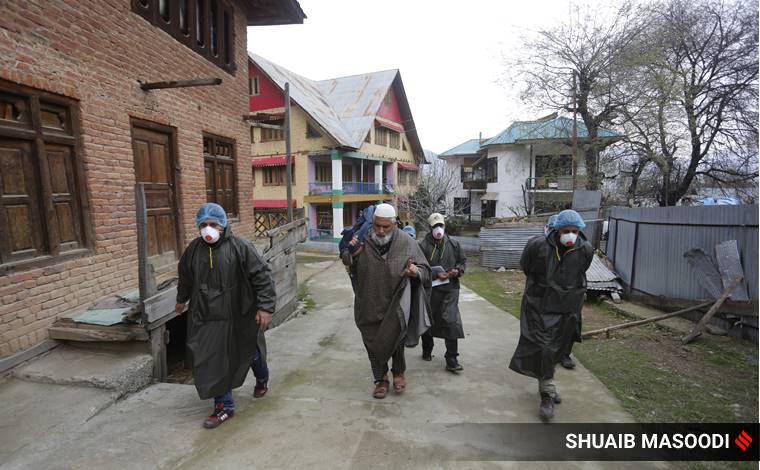 J&K Police personnel detaining members of religious group who allegedly particitated in a religious congregation in Delhi’s Nizamuddin area.