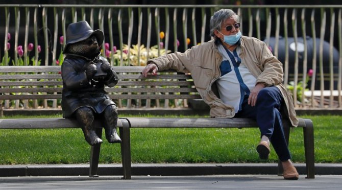 A man relaxes on a bench in London, next to a sculpture of Paddington Bear, as the country is in lockdown to help curb the spread of the coronavirus (AP Photo/Frank Augstein)