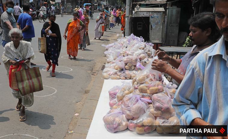 Essential grocery items being distributed among the locals at Beliaghata in Kolkata.