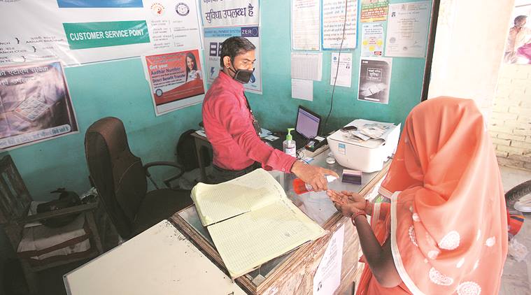 A woman sanitises her hands at a bank in Meja village of UP’s Prayagraj district. Exprss Photo by Ritesh Shukla