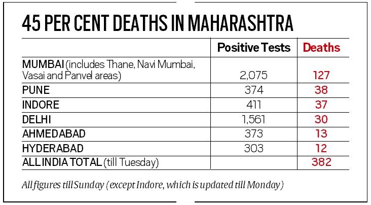 A total of 382 deaths were reported from across the country by the evening of April 14, out of which 175, or 45 per cent, had happened in Maharashtra. The Mumbai Metropolitan area, including Thane, Vasai, Panvel, Navi Mumbai and Mira Bhayandar, together had registered 127 of these deaths, while Pune had reported 38.