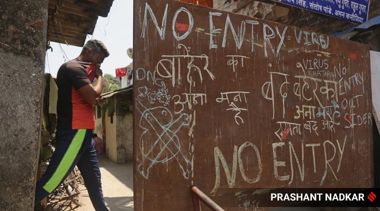Residents of Chunabhatti in Mumbai place a barrier in view of the lockdown. (Express photo by Prashant Nadkar)