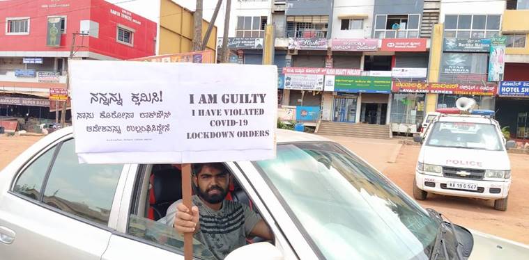 Mangaluru city Police along with Ramkrishna Mission volunteers make the lockdown violators to understand the importance of the situation and make them hold placards which says ‘I am guilty. I have violated Covid-19 lockdown orders.’