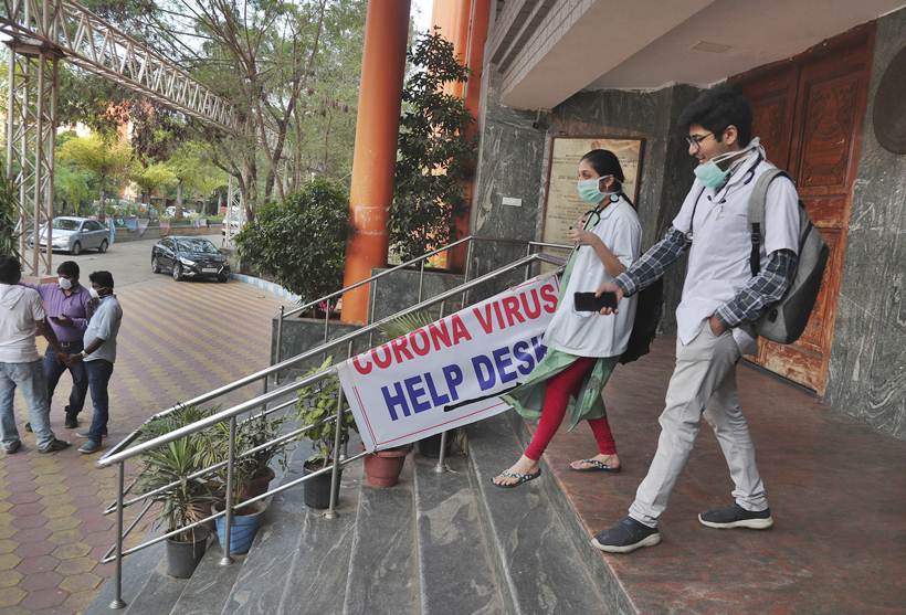 Indian doctors walk past the entrance of an isolation ward where people who returned from China are under observation at the Government Gandhi Hospital in Hyderabad, India. (AP Photo)