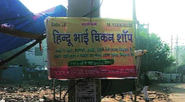 A hoarding put up at a chicken shop in Gurgaon’s Sector 37 became a cause of conflict on Thursday evening, when representatives of some Hindu outfits arrived at the spot and demanded that it be taken down. Protesters had taken exception to the establishment’s name — ‘Hindu Bhai Chicken Shop’.