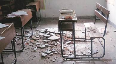 A teacher at a government school suffered injuries on her head and nose after a chunk of the roof came crumbling down in a packed classroom. The incident took place on Wednesday when Mamta Sharma was teaching Sanskrit.