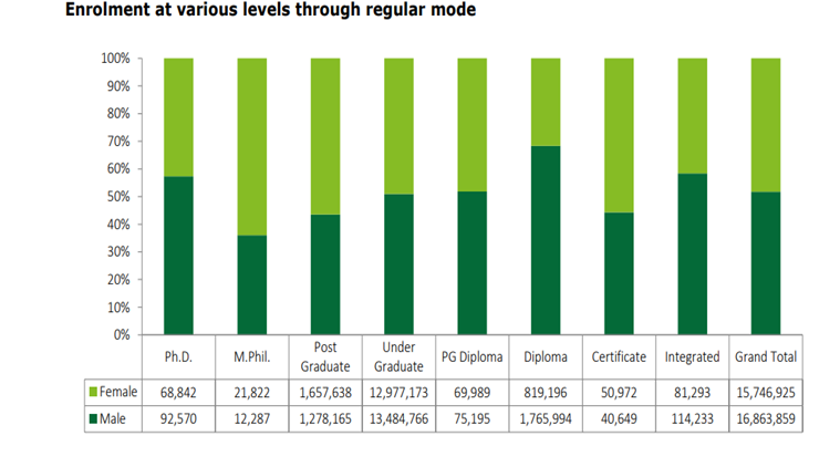 The report, released Thursday, reveals the female enrollment under various education levels has been highest in MPhil (63.98 per cent), followed by postgraduate courses (56.46 per cent) and certificate (55.63 per cent), as compared to their male counterparts. However, there is a significant gender disparity in enrollment in PhD courses with 68,842 female students registered as against 92,570 male.