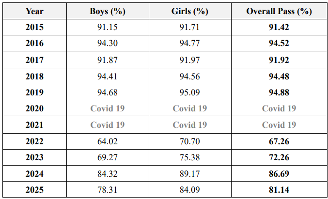 A review of year-wise performance trends from 2015 to 2025 shows consistent pass rates above 90% up to 2019, with 100% pass percentages in 2020 and 2021 due to pandemicrelated policies. The lowest pass rate was observed in 2022 (67.26%), followed by a gradual recovery to 81.14% in 2025.