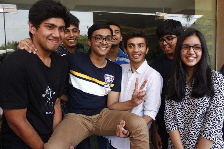 Jubilant students after CBSE 10th result in Ludhiana. Express photo by Gurmeet Singh
