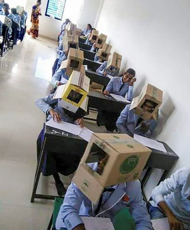 First-year science students of Bhagat PU College sit for a midterm exam with cardboard cartons covering their heads — with a hole cut out in the front for their face, in Haveri district of Karnataka, Wednesday, October 16, 2019. PTI