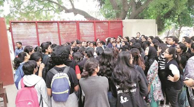 Scores of students from Lady Shri Ram College for Women (LSR) Monday protested outside the college main gate against hostel “curfew timings” and “gating out” — whereby students are told to leave the hostel for 15 days as punishment. They also temporarily blocked the road outside the college.