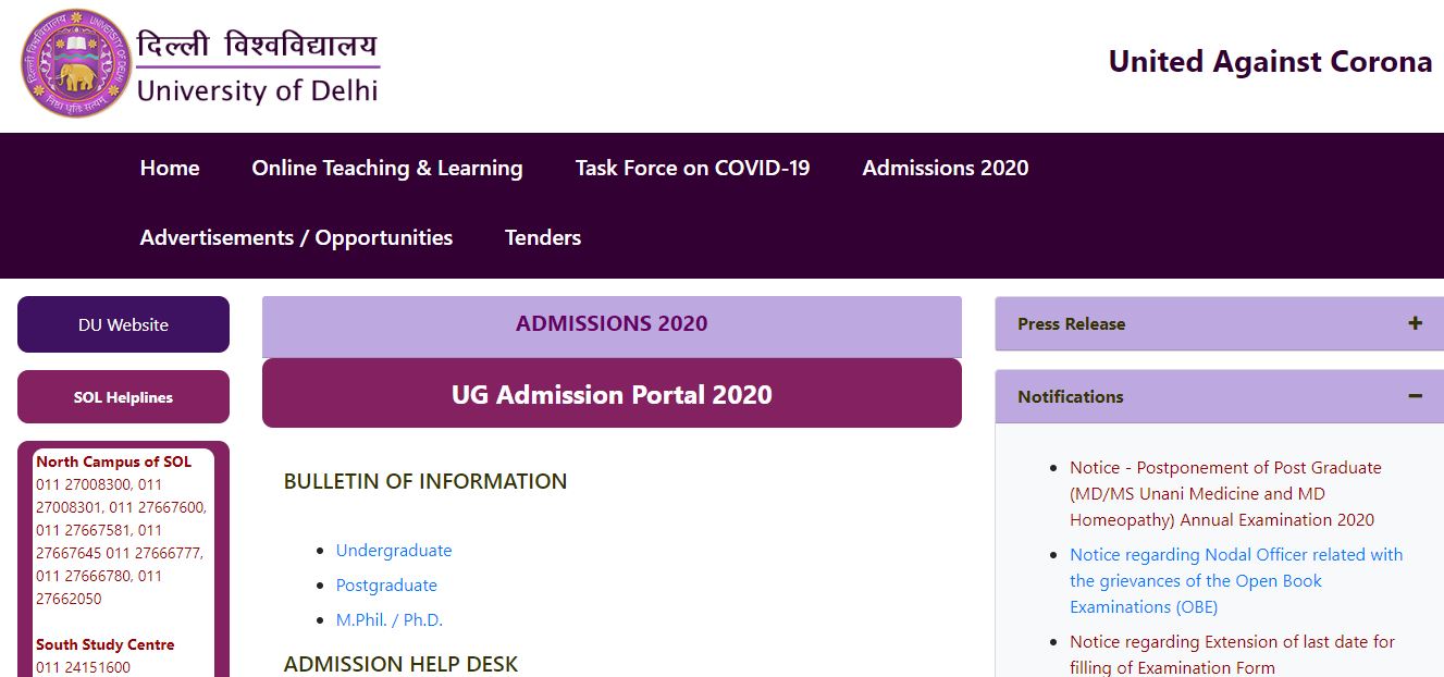 Step 2: Click on 'DU admission 2020'