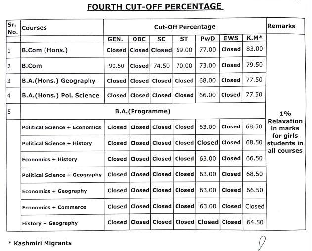 DU 4th cut-off list 2019 HIGHLIGHTS: The University of Delhi (DU) released its fourth cut-off today - July 13 (Saturday). A dip in marks needed for admission is expected. B.Com followed by BA has remained the top choice of students as most of the admissions have been in the two programmes this admission season. READ | DU admissions 2019: Hindu, Hansraj, Miranda – seats still available in top colleges Those who have marks equal to or more than that in the cut-off can take admissions in the respective college after document verification and paying an admission fee. If a candidate gets a better college or course as per their preference in this list but has taken admission based on first or second list, they will have the chance to transfer their seat. Read| How to transfer seat in DU? While the entire list will be uploaded at the official website, du.ac.in by evening, each college is displaying their individual cut-offs at their website.
