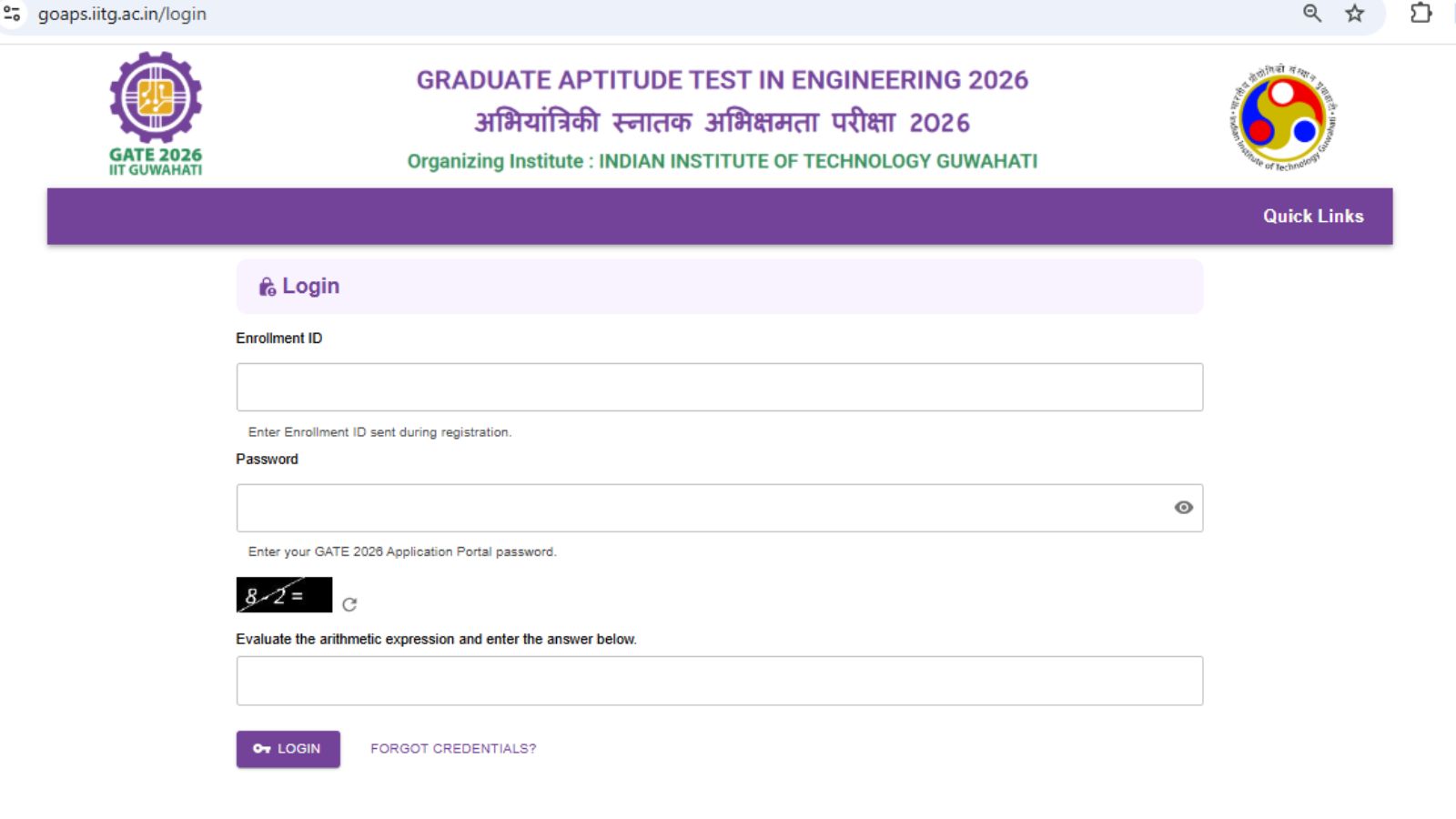 GATE 2026 admit card download link active at gate2026.iitg.ac.in (Image: goaps.iitg.ac.in/login)