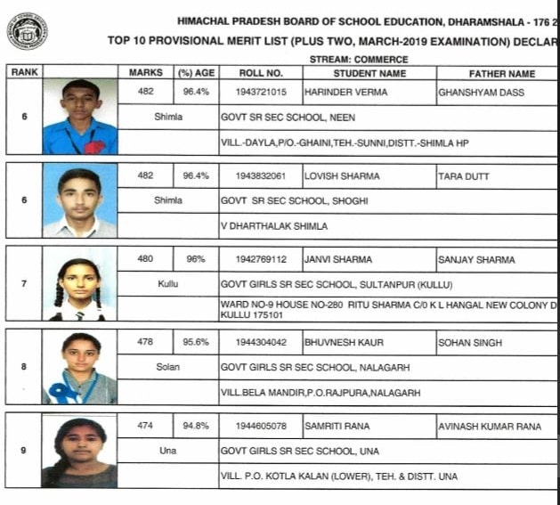 Commerce: Inder Kumar from Sarahan Govt Sr. Sec School (Sirmour) by securing 483 out of 500