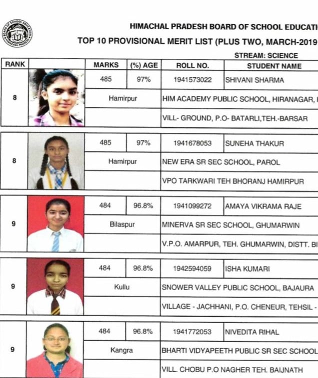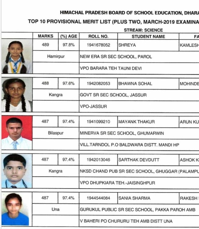 Medical: Pranjal Rana from Dhameta Govt Sr Secondary School (Kangra)secured 489 marks out of 500.