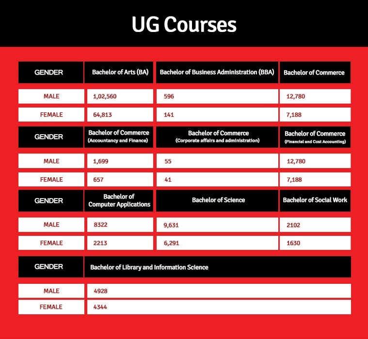 However, the scenario is quite different in post-graduate (Masters programmes) wherein certain disciplines like Master of Arts, Master of Commerce, female enrollment is much higher as compared to male students. In Master of Commerce, out of 22,100 enrolled students, 12,768 students are female and 9,332 students are male. In Master of Arts (Women and Gender Studies), out of 174 enrolled students, 147 are female and 27 are male.