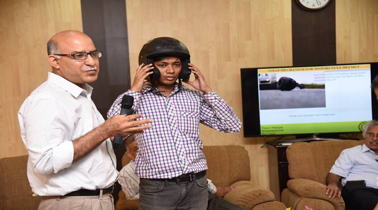 Prof Puneet Mahajan demonstrating Automatic Strap Mechanism (ASM) for motorcycle helmet at IIT Delhi Open House 2017