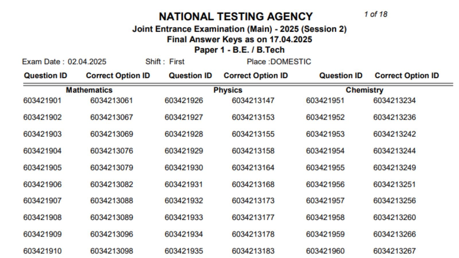 Once uploaded, the students who appeared for JEE Main 2025 session two Paper 1 (BE, BTech) can access their final answer key by visiting the official website of NTA — jeemain.nta.ac.in.