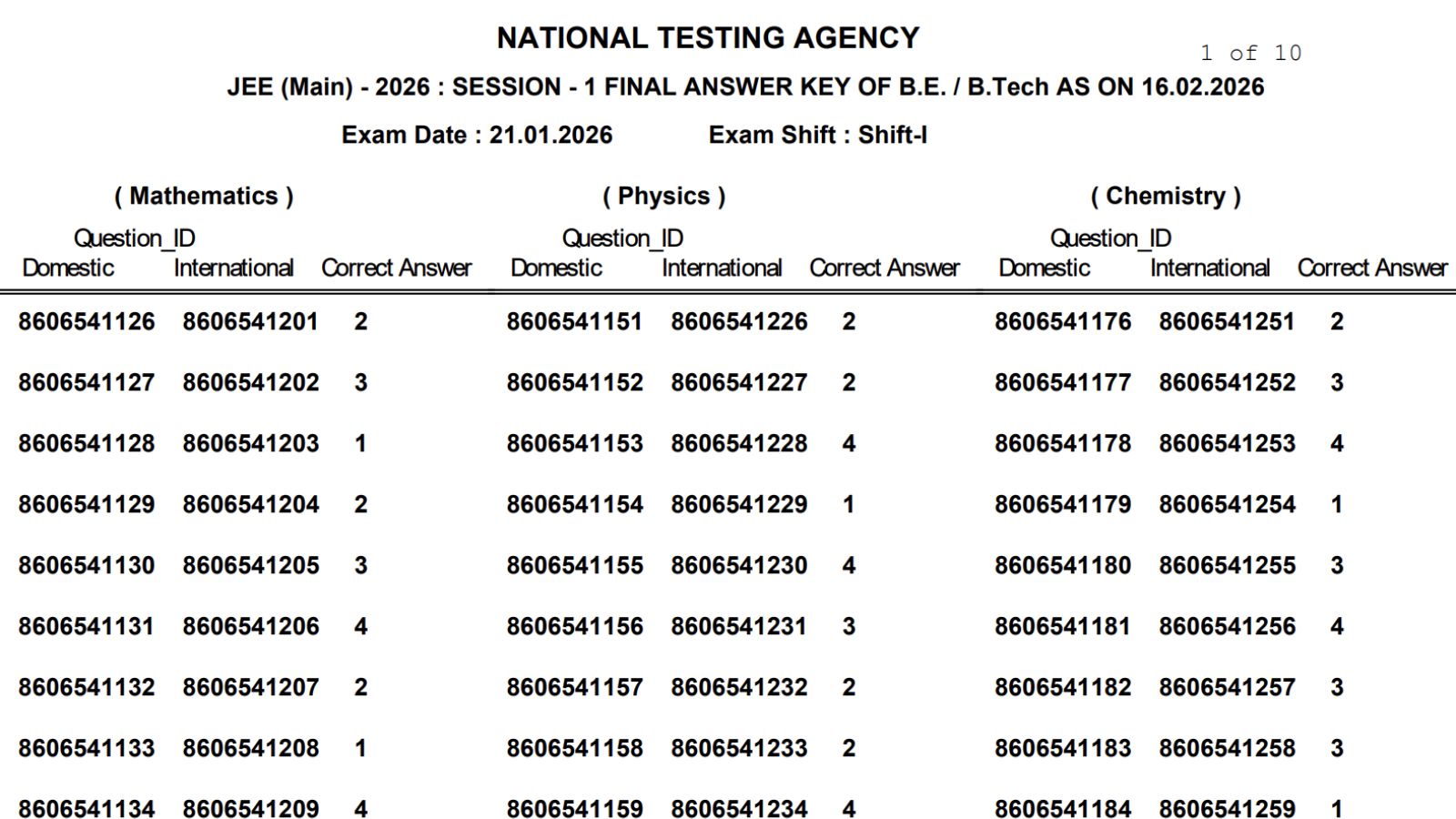 The National Testing Agency (NTA) has on February 16 released the final answer keys for the JEE Main 2026 session 1, and as many as nine questions have been dropped. Students can download the final answer keys, along with the results, from the official website– jeemain.nta.nic.in. NTA has uploaded two answer keys – one with the correct options released in the morning and the other with the correct option IDs released now.