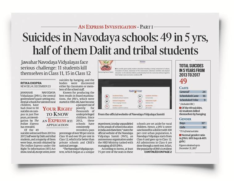 The Indian Express had reported in its edition of December 24, 2018 that the Central government’s residential schools for talented rural children had witnessed 49 student suicides from 2013 to 2017, including that of 25 Dalit and tribal students.