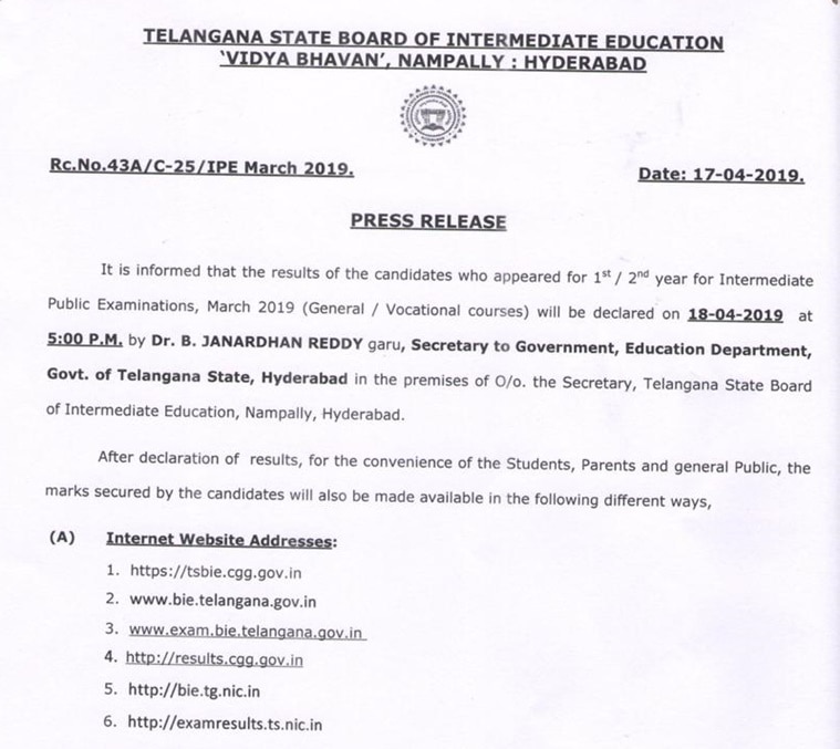 TS Inter result 2019: The results will be available on the official websites- tsbie.cgg.gov.in and results.cgg.gov.in