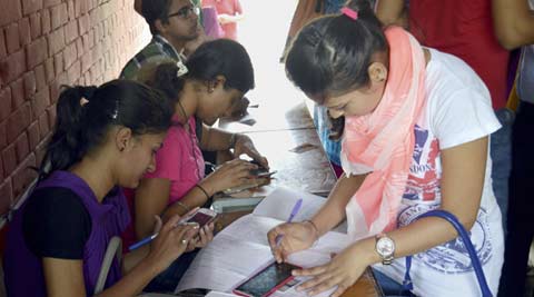 Students checking their documents during University of Delhi’s admissions