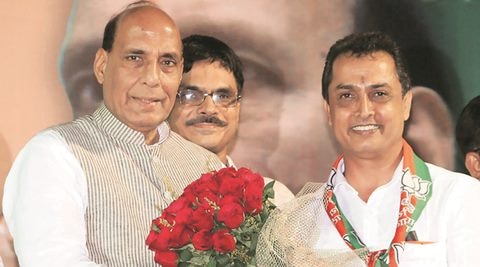 Home Minister Rajnath Singh with party candidate from Chowringhee Ritesh Tiwari in Kolkata on Monday. Express photo
