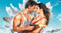 The poster shows Katrina Kaif and Hrithik Roshan wrapped around each other.