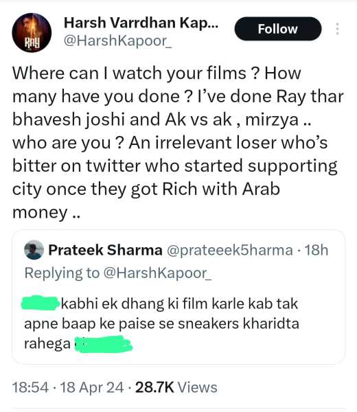Responding to the troll, Harsh wrote, “Where can I watch your films? How many have you done? I’ve done Ray, Thar, Bhavesh Joshi, and Ak vs Ak, Mirzya… Who are you? An irrelevant loser who’s bitter on Twitter who started supporting City once they got rich with Arab money…”