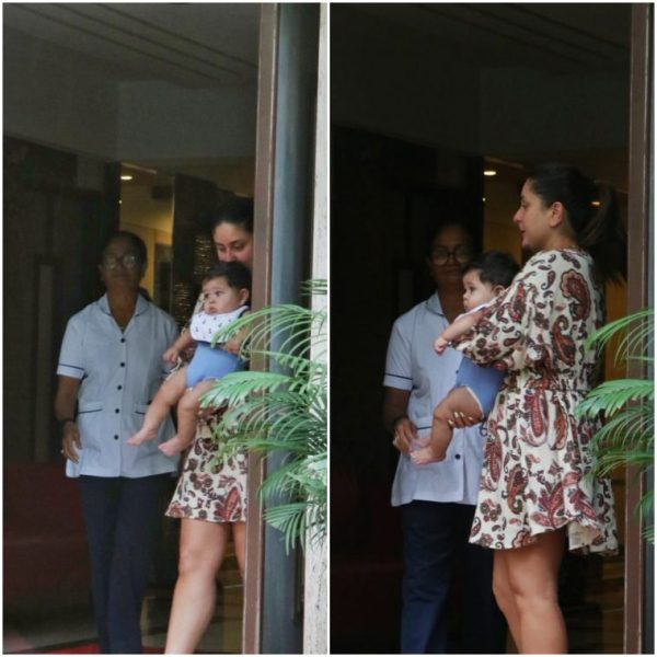 In the pictures, Kareena is seen wearing a paisley dress and the six-month-old toddler is seen donning a blue onesie, with a white bib over it. After handing the baby to Jeh’s babysitter, Kareena is seen entering her car with a mug of coffee.