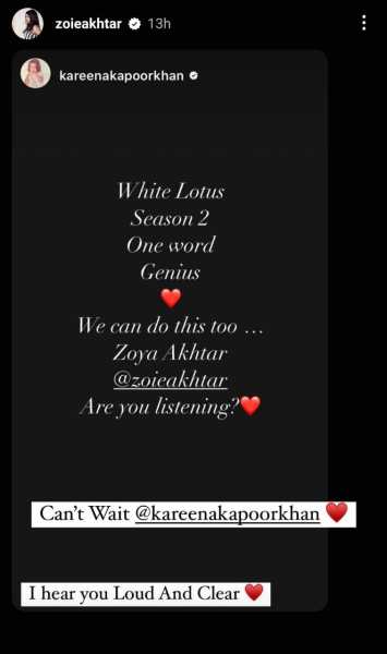 The filmmaker was quick to respond to Kareena‘s suggestion and posted her reply. Reposting her Instagram story, Zoya wrote, “Can’t wait @kareenakapoorkhan.” She also added, “I hear you Loud and Clear.” The interaction has definitely left fans excited about a future collaboration between the two talented women.