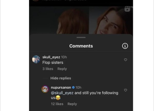 On her post, a follower commented, “Flop sisters”. Nupur gave it back to the Instagram user and wrote, “And still you’re following us” (followed by a laughing emoticon).