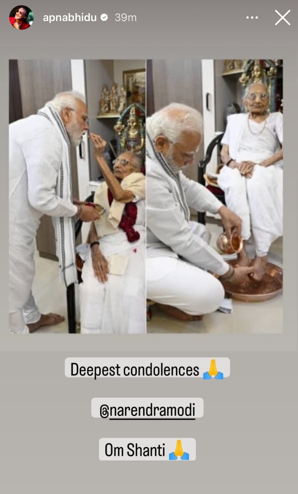 Akshay Kumar shared a tweet in Hindi which can be loosely translated as, “There is no bigger loss than losing one’s mother. May God give you the strength to survive this loss.” Kangana Ranaut shared an Instagram story and wrote, “May God give the Prime Minister the strength to get through this difficult time.”