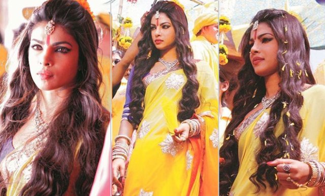 Priyanka dressed in a yellow Manish Malhotra sari complete with bangles and heavy jewellery is seen sporting tikka on her forehead.