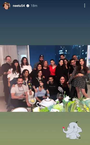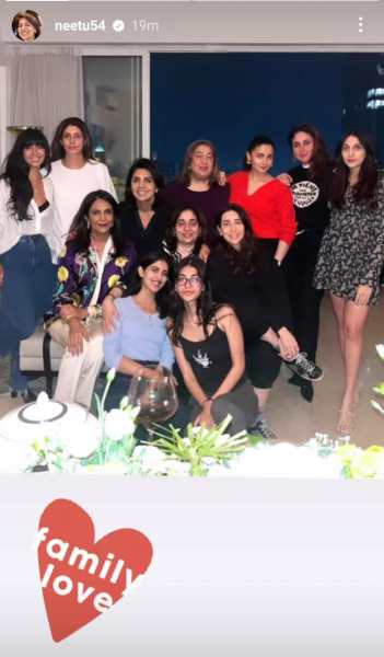 Neetu Kapoor shared a photo from their fam jam.		The Kapoor khandaan is known to be quite thick, and Karisma Kapoor’s latest photos gave a glimpse of their bond. The Bollywood actor took to Instagram to share photos of a fam jam which had Kareena Kapoor, Saif Ali Khan, Ranbir Kapoor, Alia Bhatt, Neetu Kapoor, Adaar Jain, Navya Nanda, Shweta Bachchan, among others, in attendance.