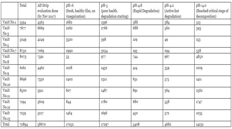 The situation was worst in Vault No 8 where, of the total 7,591 reels on which AD strip tests were performed (of 8,067 reels stored in that vault), only 53 were unaffected by vinegarisation. Around 2,688 reels were in various stages of deterioration while as many as 4,850 reels had reached an acidity level of pH value less than 4 which damages the reels permanently. These reels contain over 300 films, including all nine double reels of Awaara, seven out of eight reels of a print of Do Bigha Zameen, all eight reels of release positive of Mother India, two prints of Kalia Mardan containing five reels each, and three prints of Sahab Bibi aur Ghulam.