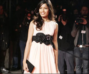 Pinto,who shot to international fame with her brief role as Latika in multiple Oscar winning film ;Slumdog Millionaire,posed for photographers in a glamorous cream dress at the show.