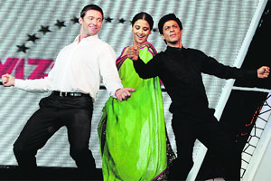 In Mumbai as the celebrity guest at the FICCI convention,Jackman was a part of the valedictory session with Shah Rukh Khan as Karan Johar played host. As the house went up in applause upon his arrival with wife Deborra Lee-Furness,Aishwarya Rai-Bachchan introduced him. Women especially were seen craning their necks for a good look at the actor who looked dapper in a grey suit and short cropped hair.