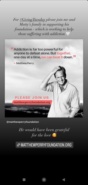 “For #GivingTuesday please join me and Matty’s family in supporting his foundation—which is working to help those suffering with addiction. He would have been grateful for the love,” Aniston wrote.