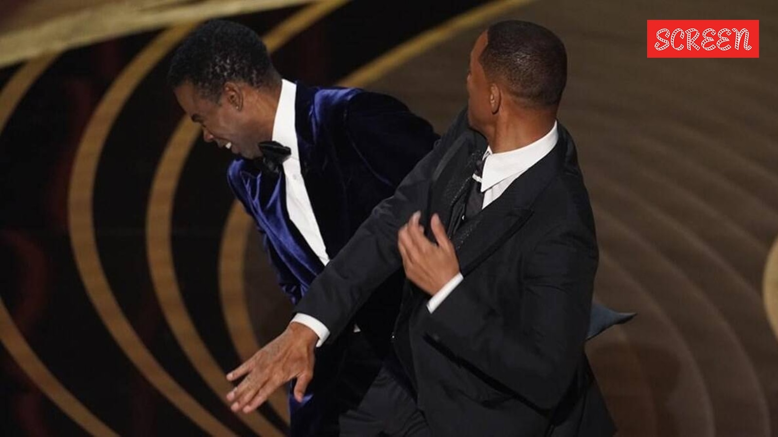 Will Smith, right, hits presenter Chris Rock on stage while presenting the award for best documentary feature at the Oscars on March 27, 2022, at the Dolby Theatre in Los Angeles. (AP photo/Chris Pizzello)