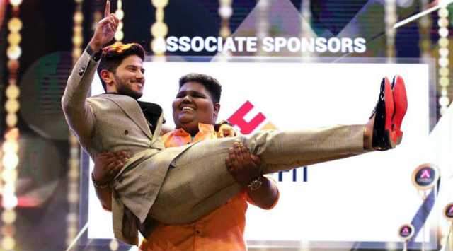Singer Vaishnav Girish lifts Malayalam star Dulquer Salmaan at Asiavision Movie Awards 2017 in Dubai. He earlier lifted Bollywood superstar Shah Rukh Khan during a reality TV show.