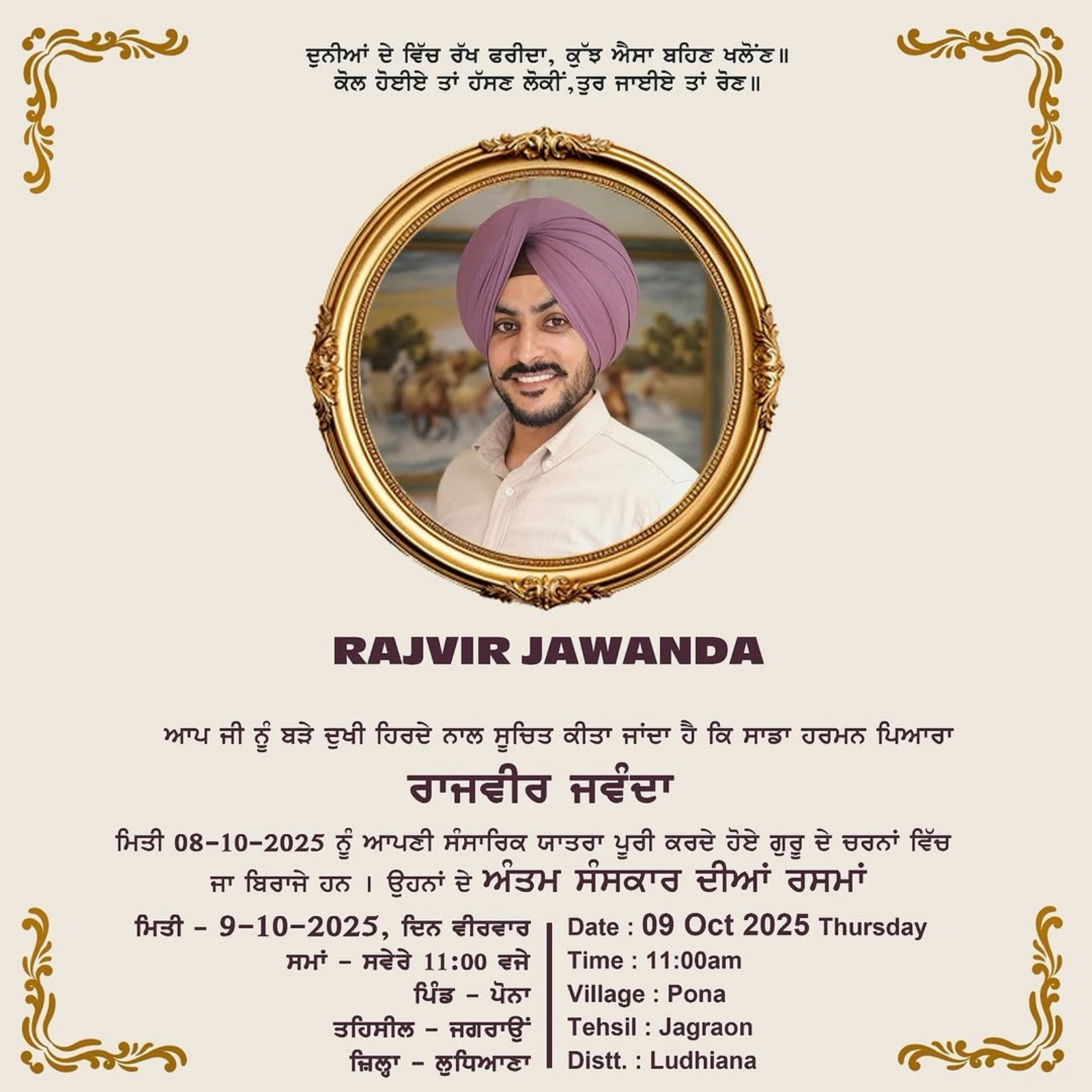 Rajvir Jawanda Death News Reaction Live Updates: Rajvir Jawanda's last rites to take place on Oct 9