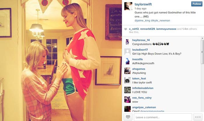 The “Blank Space” hitmaker shared a photo of her kneeling while touching King’s baby bump along with caption, “Guess who just got named Godmother of this little one….. (ME) @jaime_king @kyle_newman.”