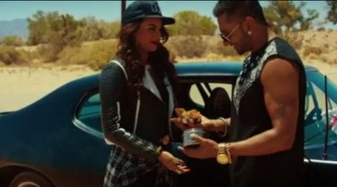 The actress, who is known for her desi roles, is seen in a different avatar as a cool LA girl in the video. She plays Honey Singh’s girlfriend. We can’t exactly say it’s a good look though with the garish makeup and over-the-top supposed coolness. The video shows how Honey Singh and Sonakshi elope to be together but fail.