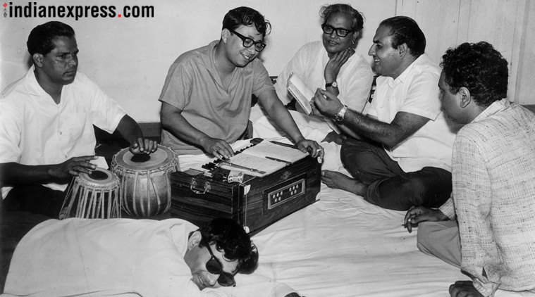 Actor Dev Anand, film director Amarjeet, singer Mohammad Rafi, lyricist Majrooh Sultanpuri and music director RD Burman during the song rehearsal of film ‘Teen Deviyaan’. (Express archive photo)