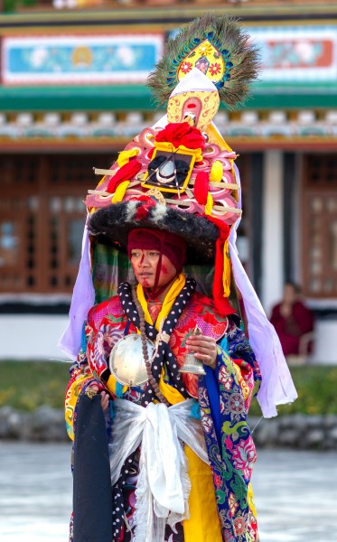 Drag-dmar Chaam: Held in the Pemayangtse monastery in west Sikkim, the Drag-dmar chaam sees mask-dances performed on the first two days of a festival that marks the end of one year and the beginning of the Tibetan New Year. Lamas from the monastery dress up as Mahākāla and Guru Drag-dmar to engage in a mock battle that signifies victory of good over evil. On the last day, a giant embroidered Buddha-scroll (Thankga) is displayed at the monastery.