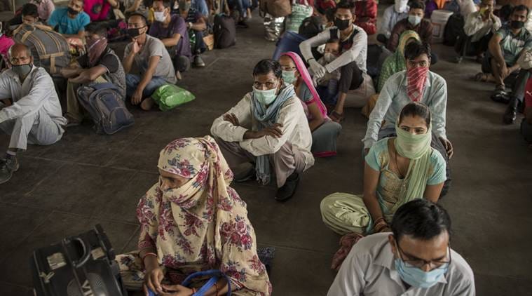 Migrant workers sit at a bus terminal as they wait to catch state-provided transportation in Noida. (Photographer: Anindito Mukherjee/Bloomberg)