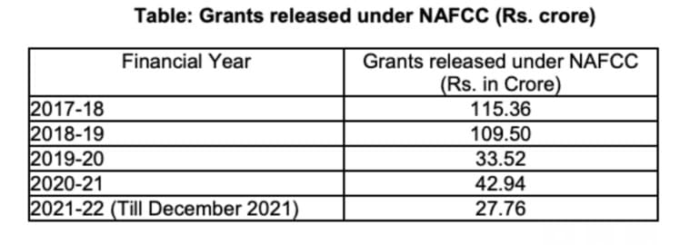 Along with the Climate Change Action Programme, NAFCC is one of the two key schemes run by the Centre. Under the NAFCC, 30 projects with an allocation of Rs. 847.5 crore were sanctioned between 2015-19.