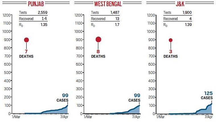 Coronavirus curve in India: Punjab and West Bengal had 99 cases as of April 7, while Jammu and Kashmir had 125.